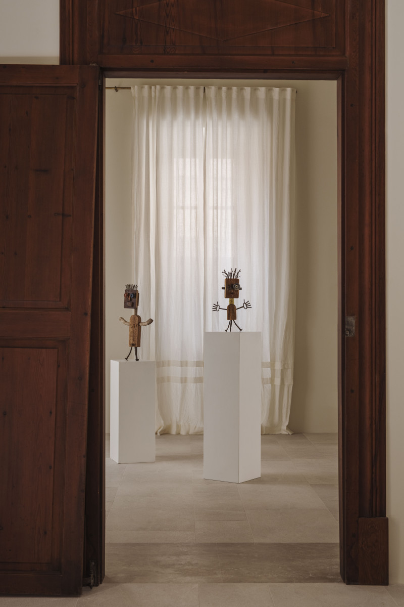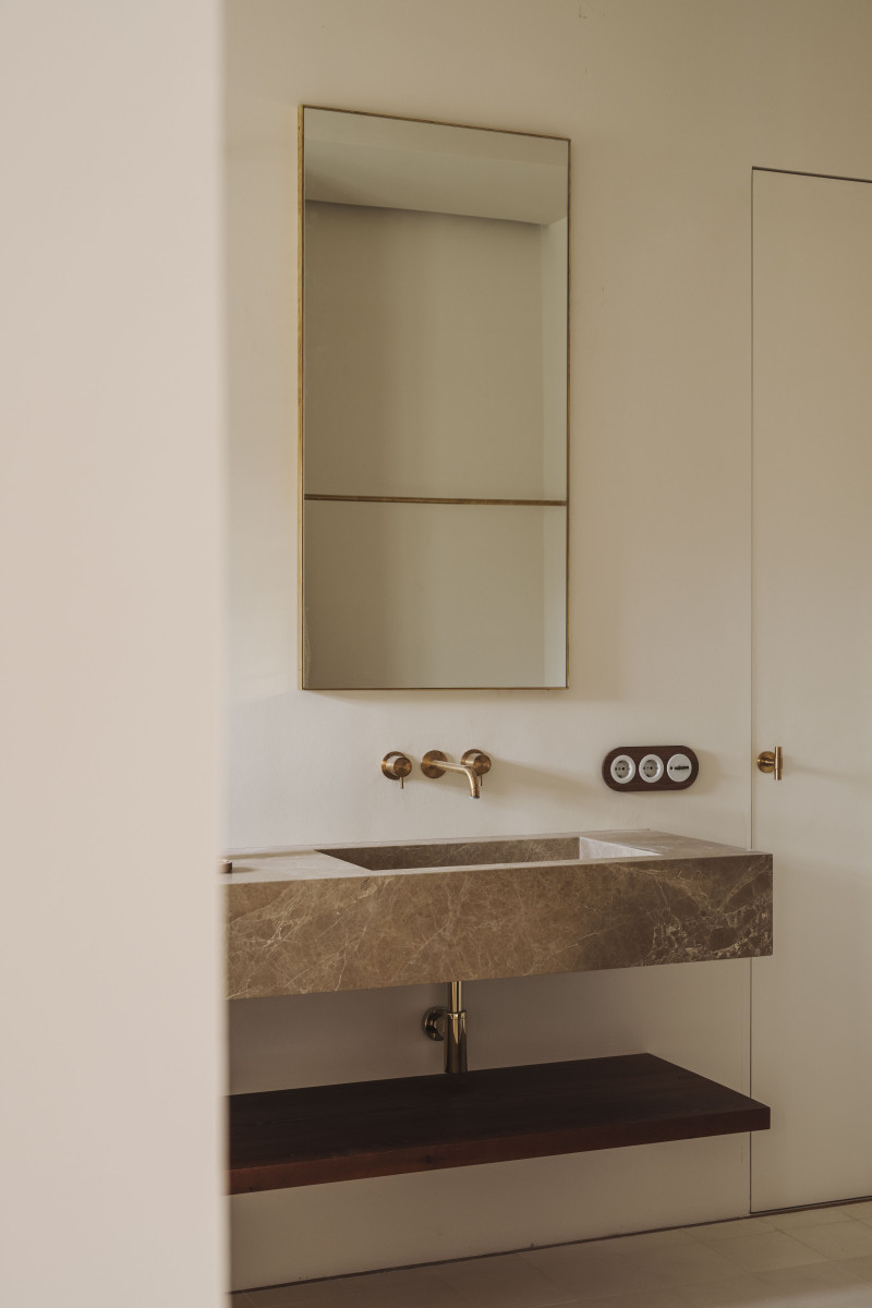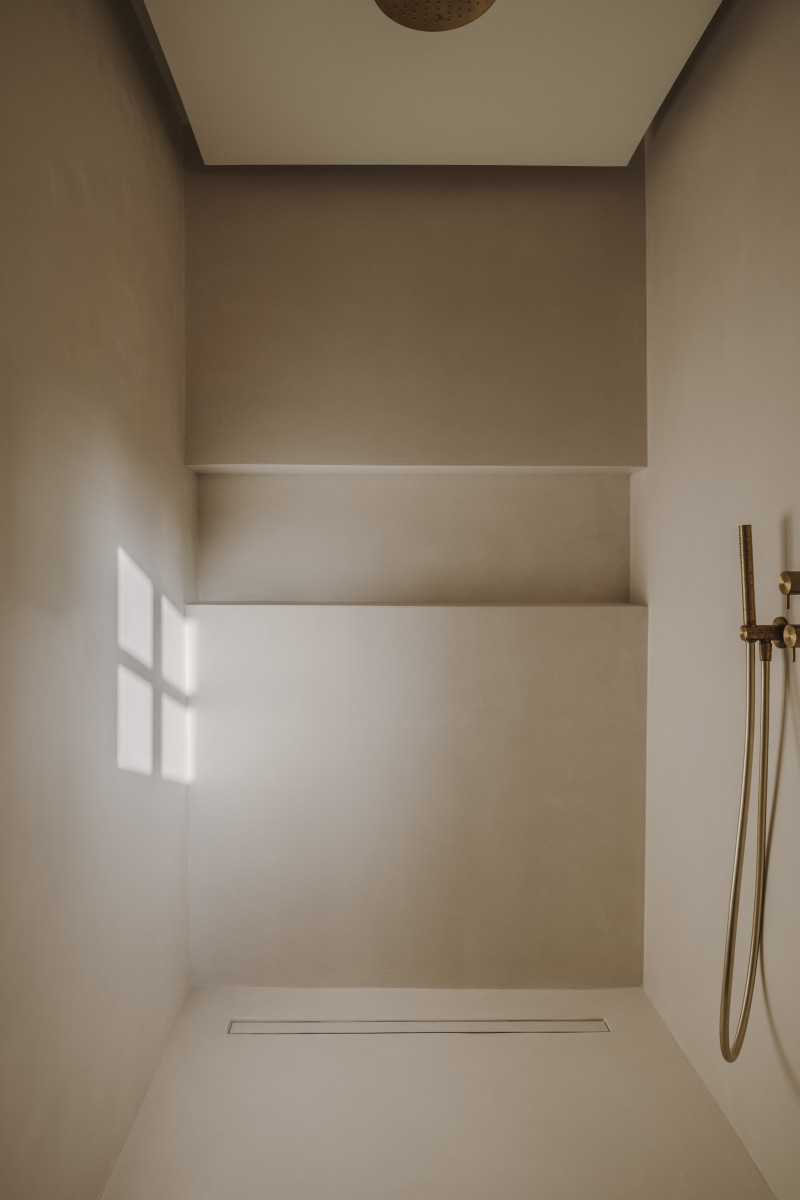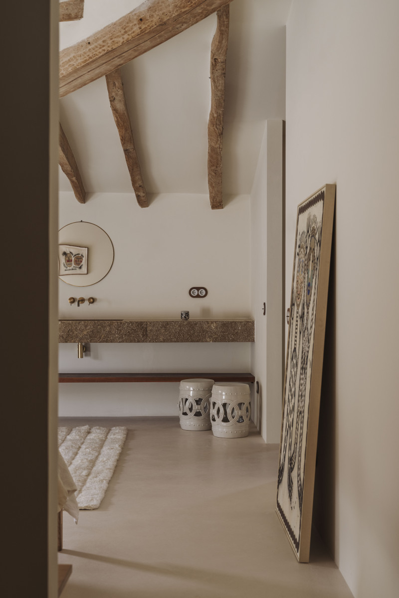 The ground floor hosts the most communal spaces: a living room, dining room, kitchen and an art gallery — all connected not only with each other, but also with the village through the continuous flooring. Interior and exterior merge, creating constant exchanges between inside and out, inviting a fluid interaction with the surrounding life. Original materials are combined with spatial decisions that support daily living, enhancing continuity and warmth throughout the main floor.