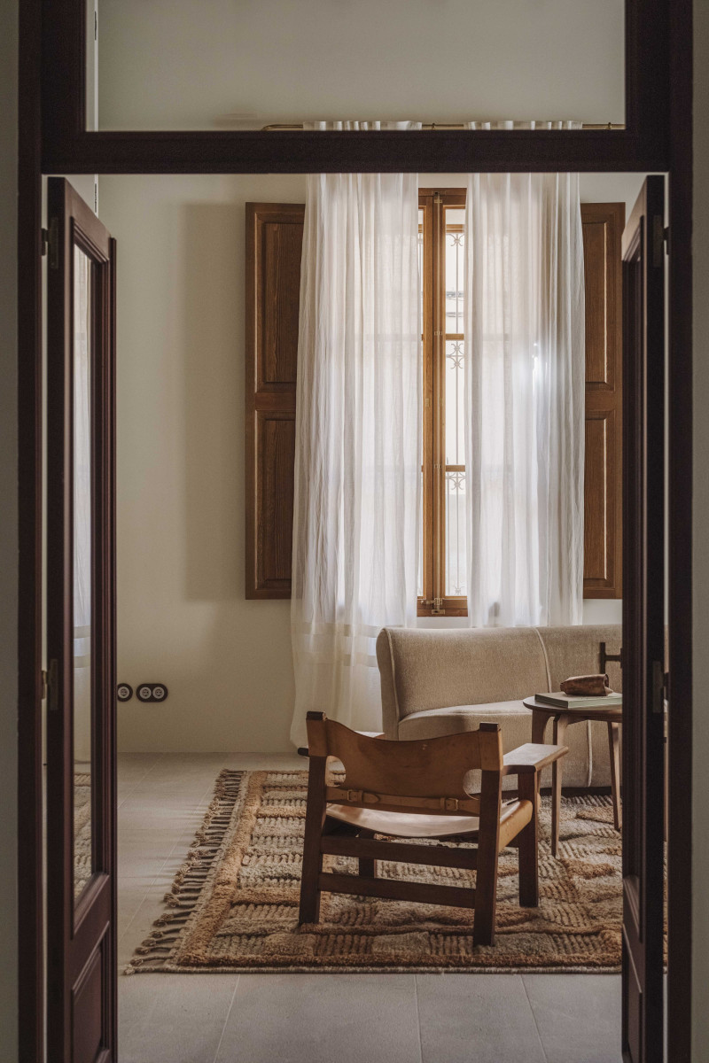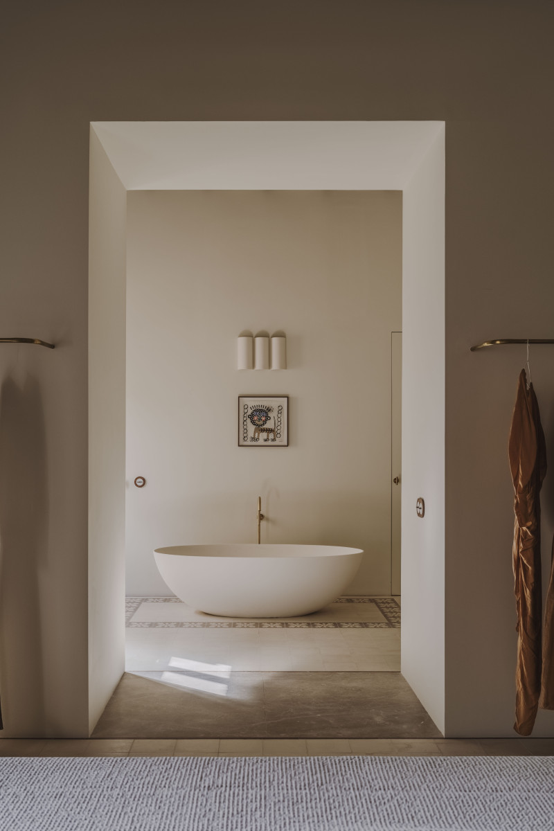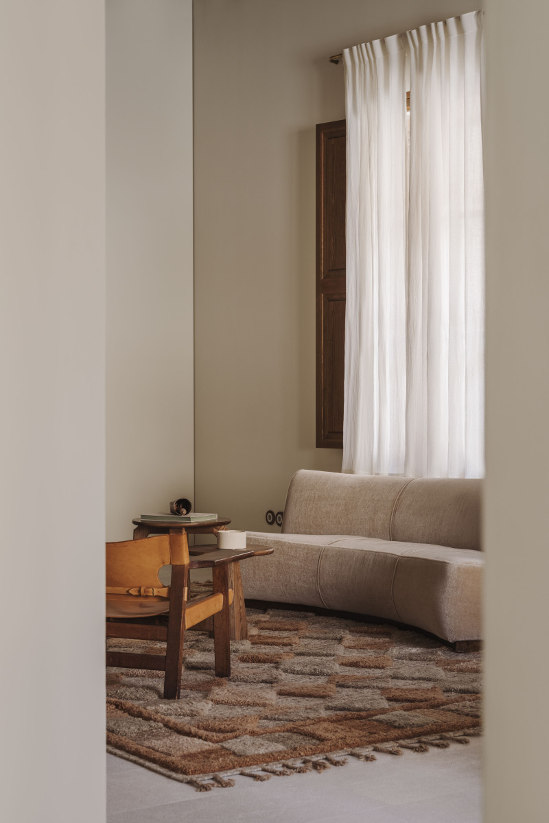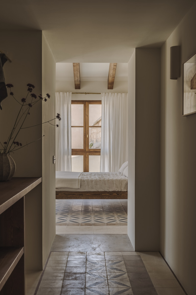 On this floor, the house shows its most refined character. Wood, encaustic tiles, stone and the junction details between them all highlight the architecture and light. With a neutral palette and the proportions of the original house, the bedroom design is defined by comfort and brightness.