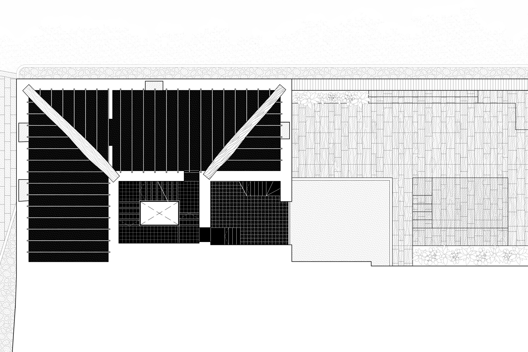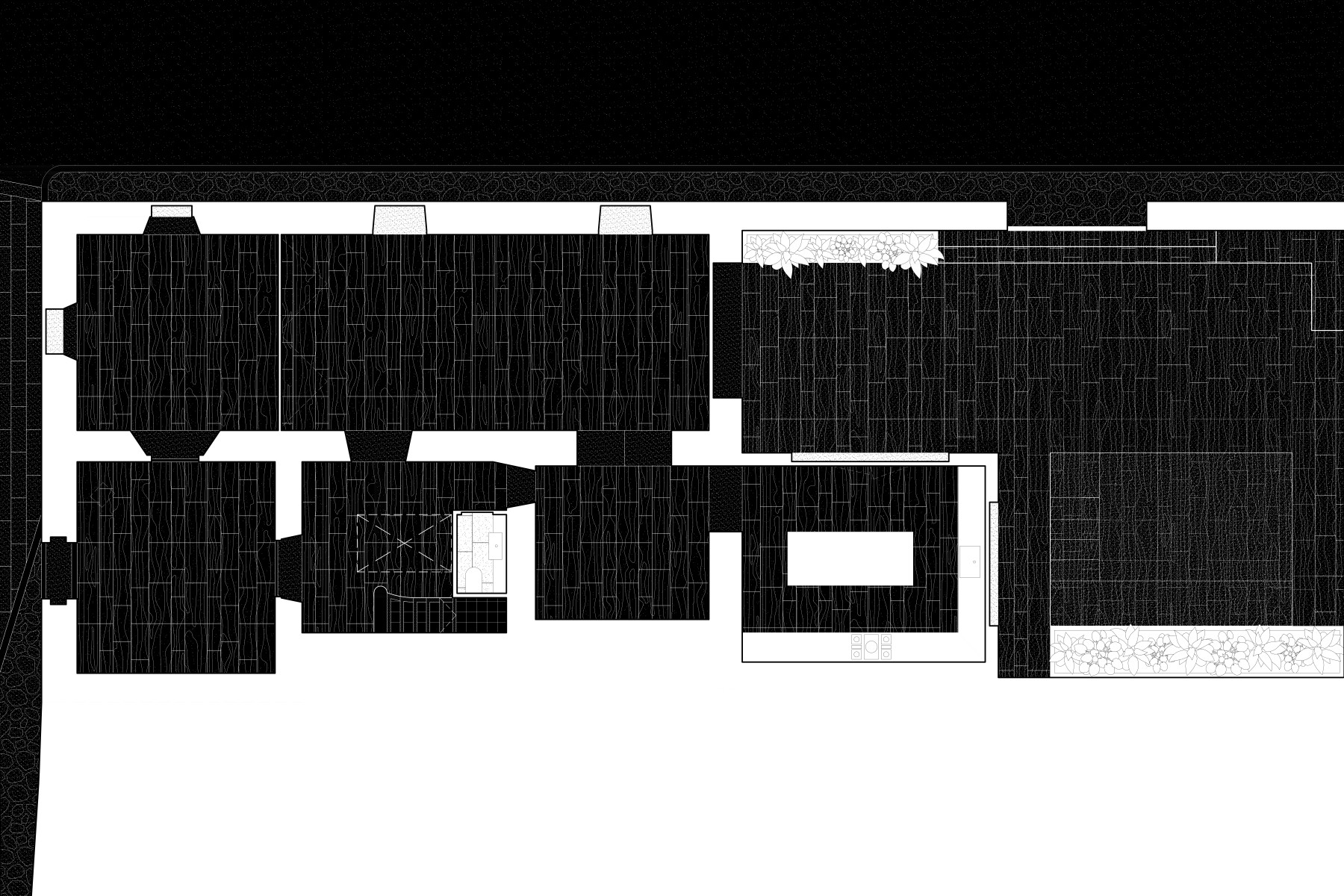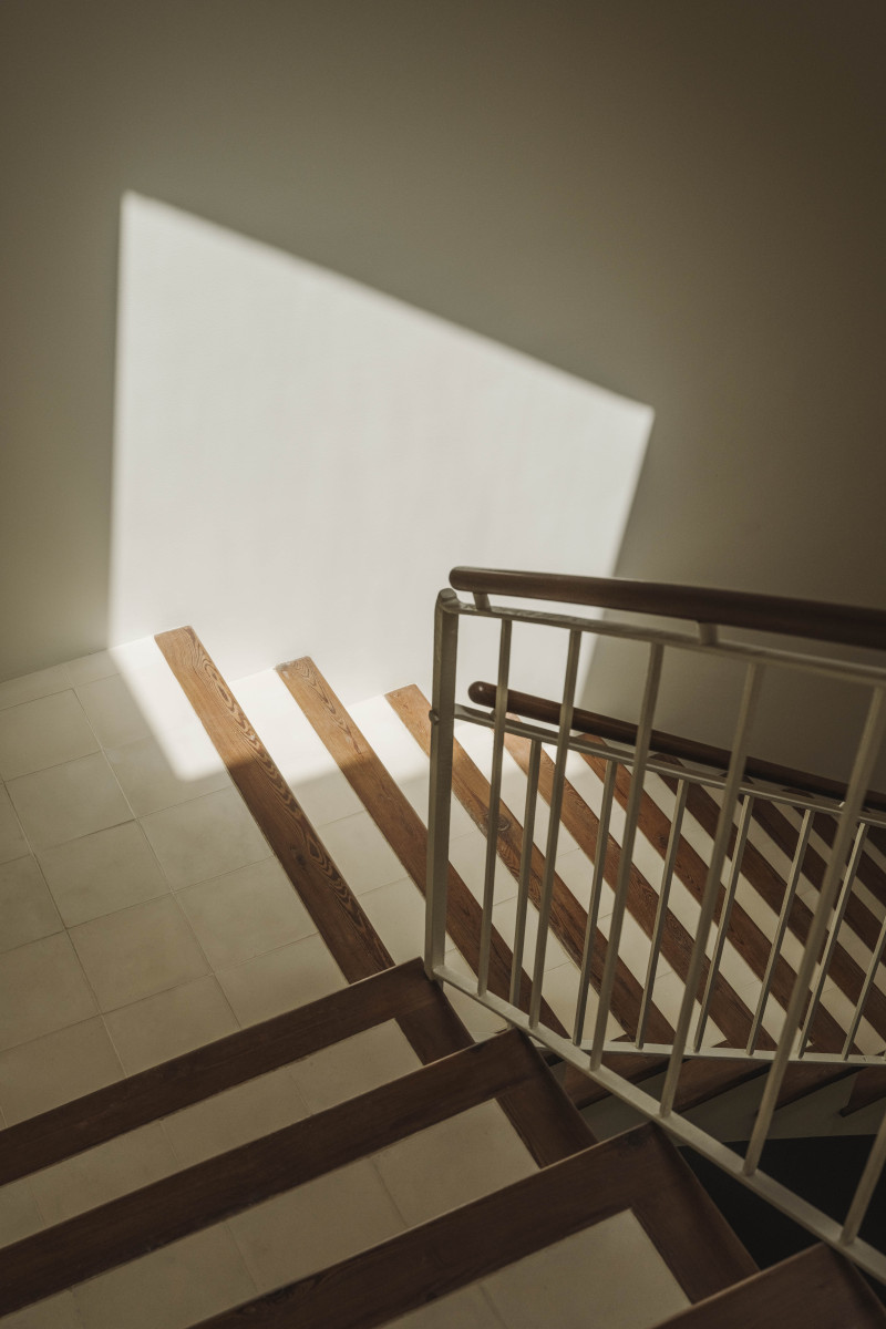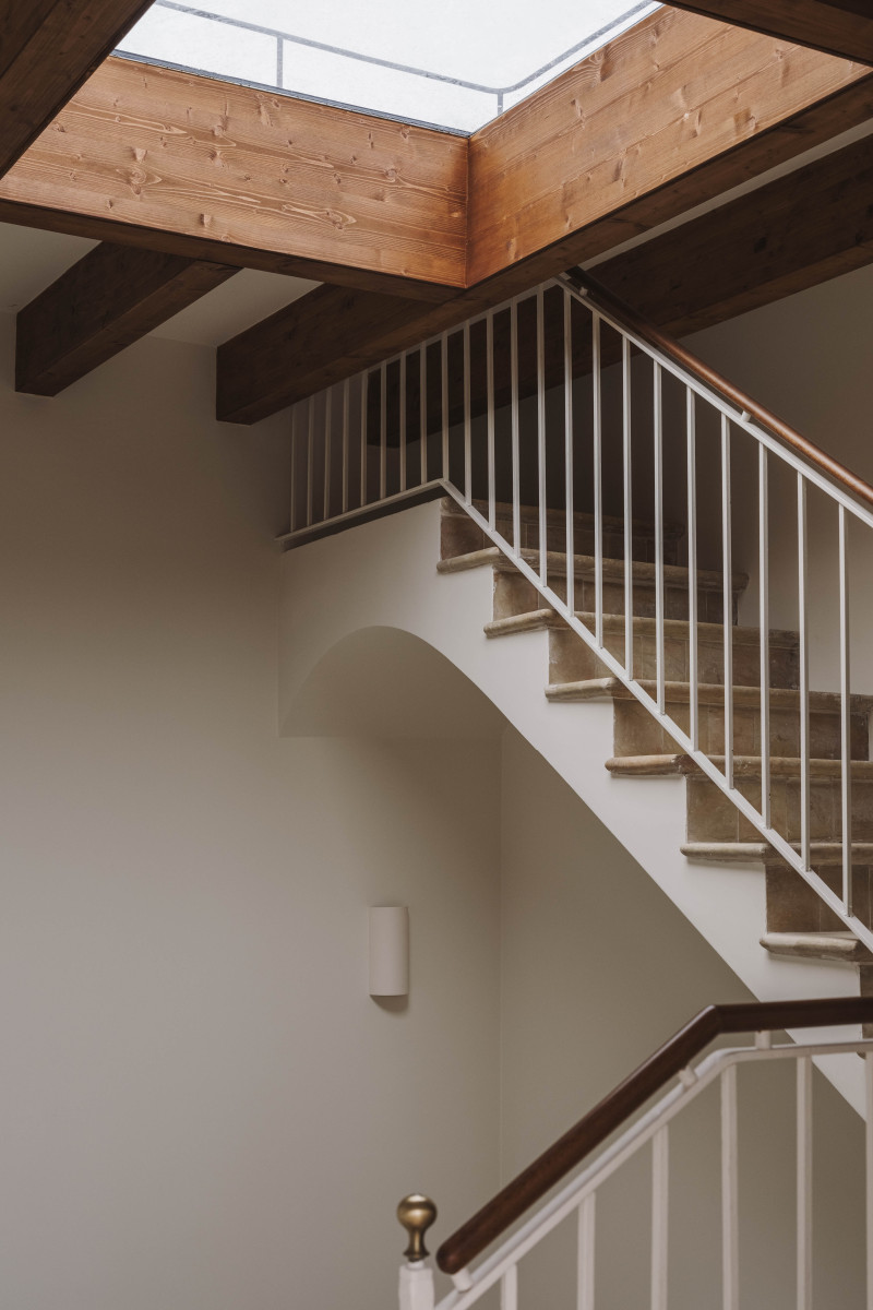 A middle level, accessed via a noble vaulted staircase protected as local heritage, is bathed in light from a new skylight that transforms the space into a pause — a place where the three worlds meet.