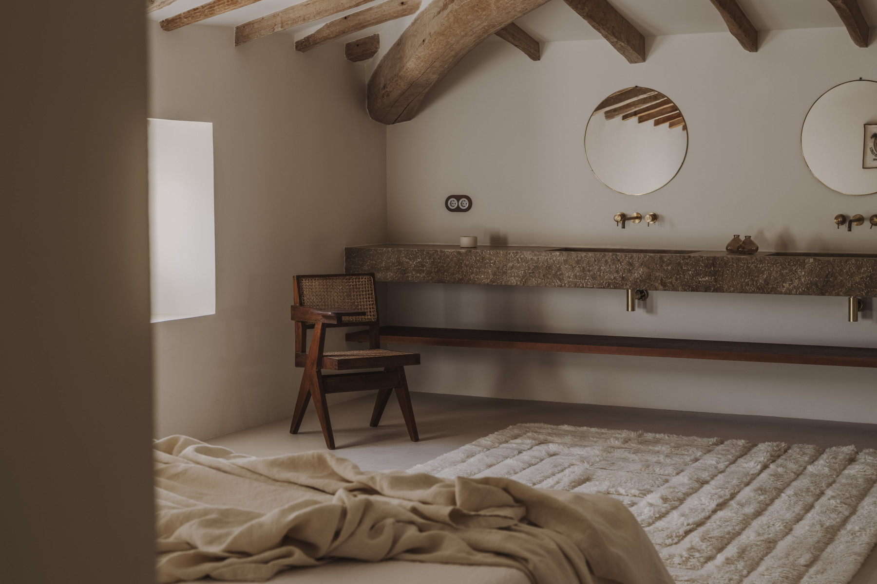 En esta planta, la elegancia de la casa luce su mejor cara. Madera, las baldosas hidráulicas, la piedra, y los detalles de unión de todos los elementos, sirven para enfatizar la propia arquitectura y la luz de la casa. Con una paleta de materiales neutros y las proporciones de la casa original, el diseño de los dormitorios queda definido por la comodidad y luminosidad de los espacios.