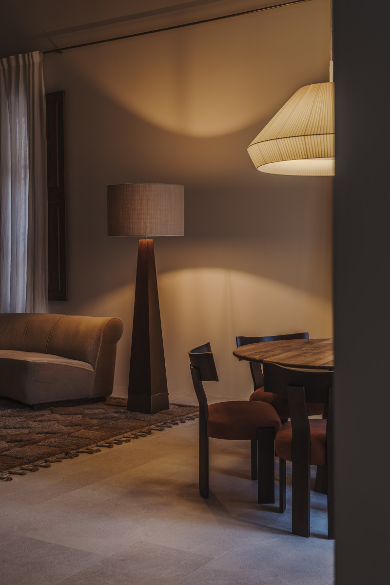 Una planta baja donde podemos encontrar los espacios más comunes: un salón, un comedor, una cocina y una galería de arte, todos relacionados tanto entre ellos como con el pueblo a través del pavimento. Exterior e interior se funden, creando miradas constantes entre dentro y fuera y generando espacios propicios para una interacción muy importante con el exterior. Los materiales originales se combinan con decisiones espaciales que apoyan la vida cotidiana, realzando la continuidad y la atmósfera cálida de la planta principal.