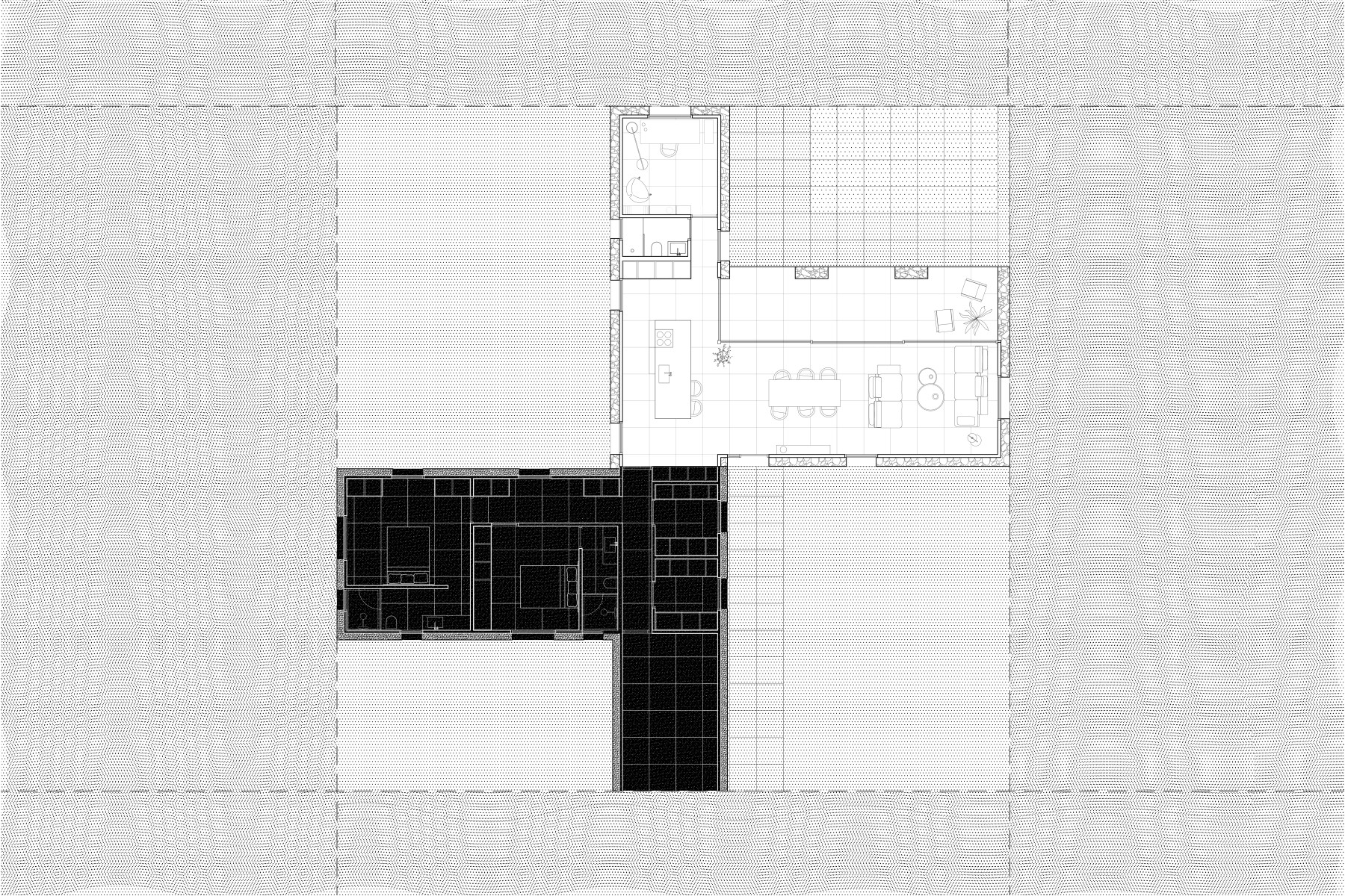 La casa viene conformada por dos volúmenes en forma de L posicionados en simetría axial, dando lugar a una planta cruciforme con un eje alineado en el que se situarán todos los servicios y dos ejes desalineados en los que se albergarán los usos principales. Una de estas piezas albergará la zona de día mientras que otra acogerá el área de noche; dos fuerzas fundamentales opuestas y a la par complementarias que tensionan la mirada de la casa hacia el exterior.