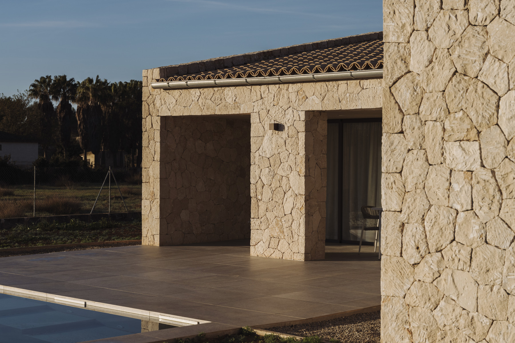 Nos encontramos al norte del municipio de Muro, en Mallorca, en una zona agrícola muy cerca de la zona costera, en la que el llano paisaje agreste comienza a respirar el aire litoral. Un lugar contrapuesto en sí mismo, donde convive la aridez del campo con la fertilidad de la albufera. Otra dualidad más que acompañará al proyecto de esta casa, conduciendo toda una serie de decisiones hacia la duplicidad y lo confrontado.