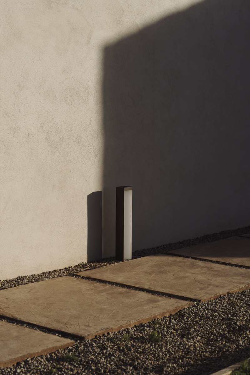 Hacia el exterior, estas dos alas se expresan a través de una selección de materiales contrarios entre sí, de tal modo que un revoco fino que traslada un temperamento de calma envuelve el área de noche, mientras que una piedra más cálida e irregular lo hace con el área de día. Un modo más de exteriorizar y remarcar la dualidad como elemento generador de la casa.
