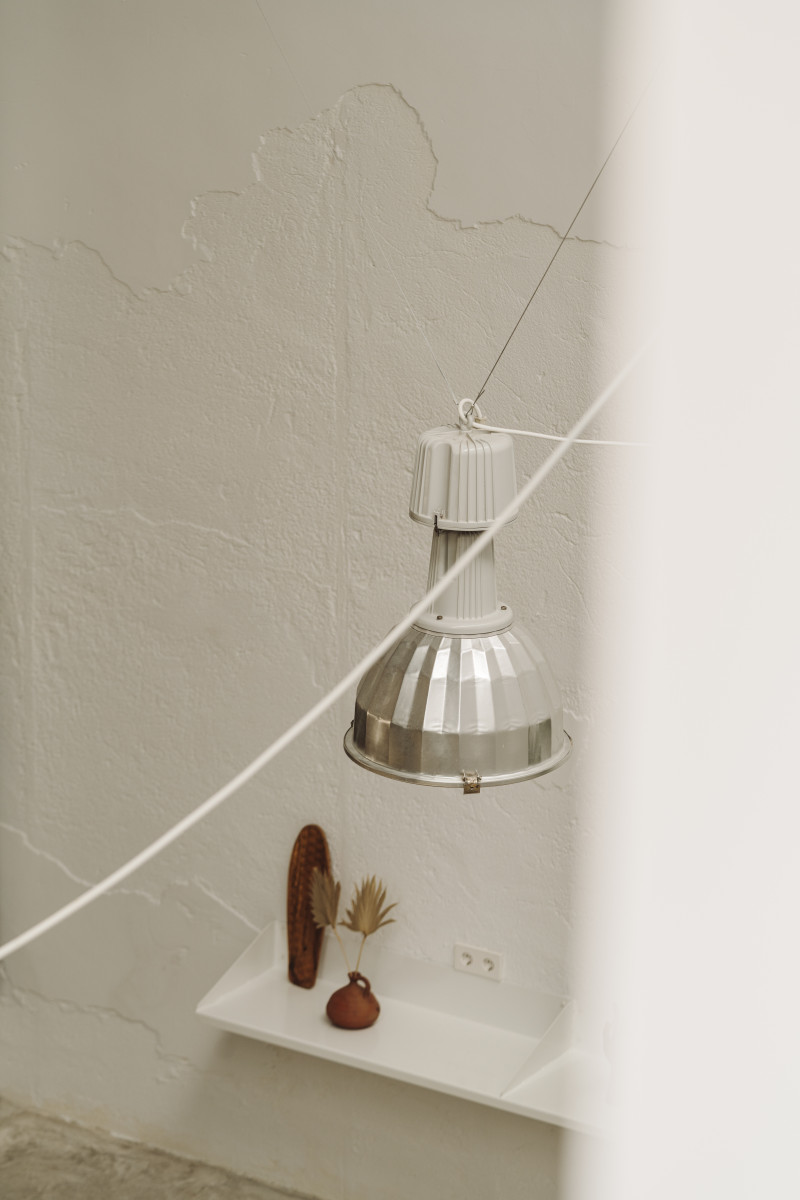 En tercer lugar, se da una nueva vida a las paredes de la nave. Se rascan, recuperando el carácter de unos muros con una gran potencia en cuanto a su textura y se pintan de color blanco puesto que, como comentamos, nos interesa seguir construyendo el vacío y estos cerramientos serán su contenedor. Junto con esto, se hace un nuevo suelo empleando hormigón pulido. No se dará ningún acabado ni se vitrificará puesto que, una vez más, no queremos que saque protagonismo al aire que encapsularemos, pero sí que se dibujen unas líneas con las juntas de dilatación que formarán una retícula de 3 x 3.
