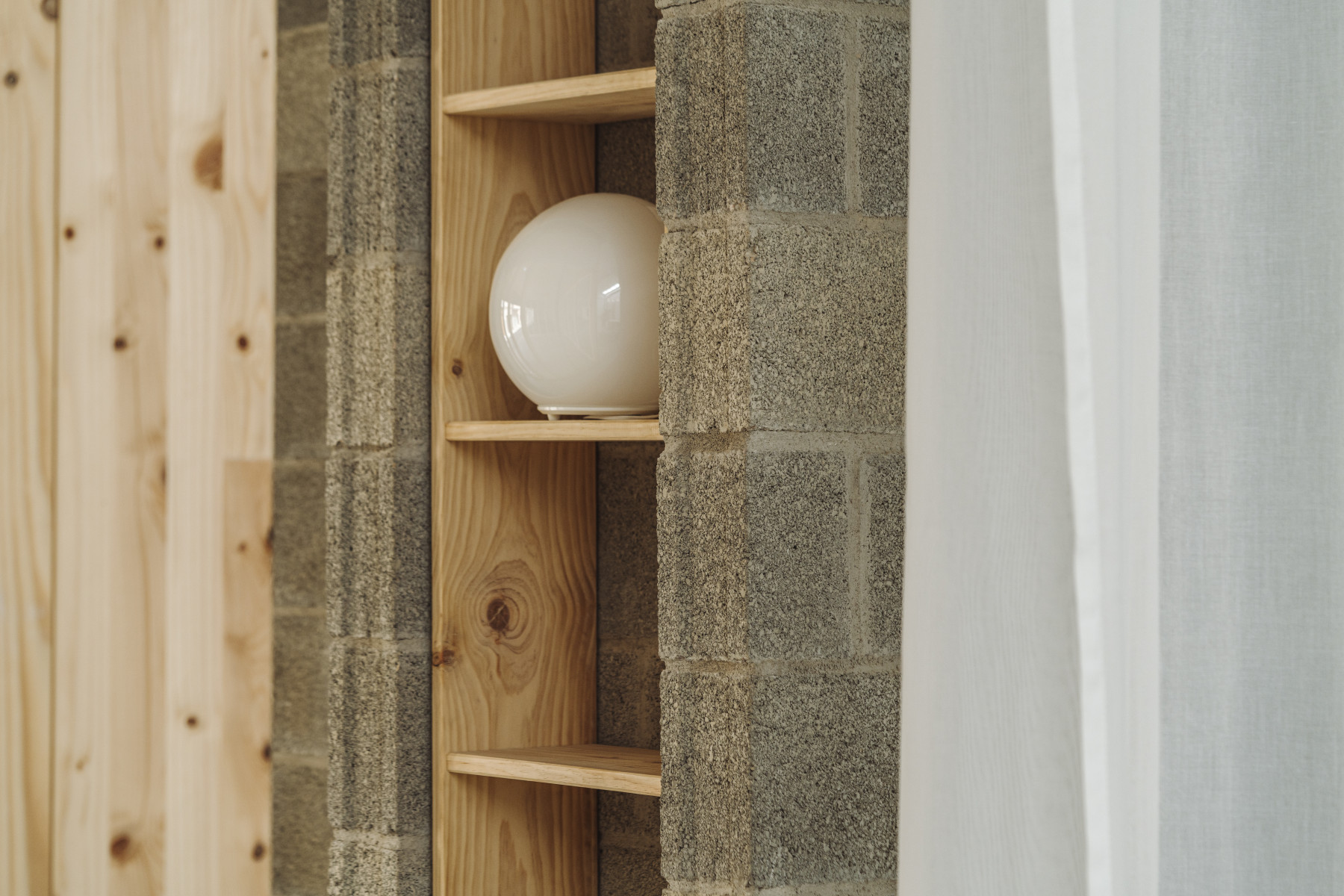 La hilera más próxima a la fachada de la calle alojará tres cuadrantes especiales. El cambio de pendiente para desaguar hacia fachada nos da la posibilidad de enfatizar la diferencia y decidimos construir un “batiport” de grandes dimensiones. Este permite la entrada del pavimento de la acera a todo el cuadrante central, el que acerca la calle en el estudio y aporta un extra de luz en el interior. Encima de este nuevo “batiport” y a diferencia del que se hace convencionalmente, decidimos construir una caja de madera con dos pequeñas habitaciones de invitados. Con este gesto, el cuadrante central coge toda la altura de la nave y divide la hilera central en tres espacios con volumen propio. A un lado construimos un mueble de bloque de hormigón visto que esconderá baños y cocina, mientras que el otro, con un carácter más privado gracias a las cortinas, se destinará a las reuniones.